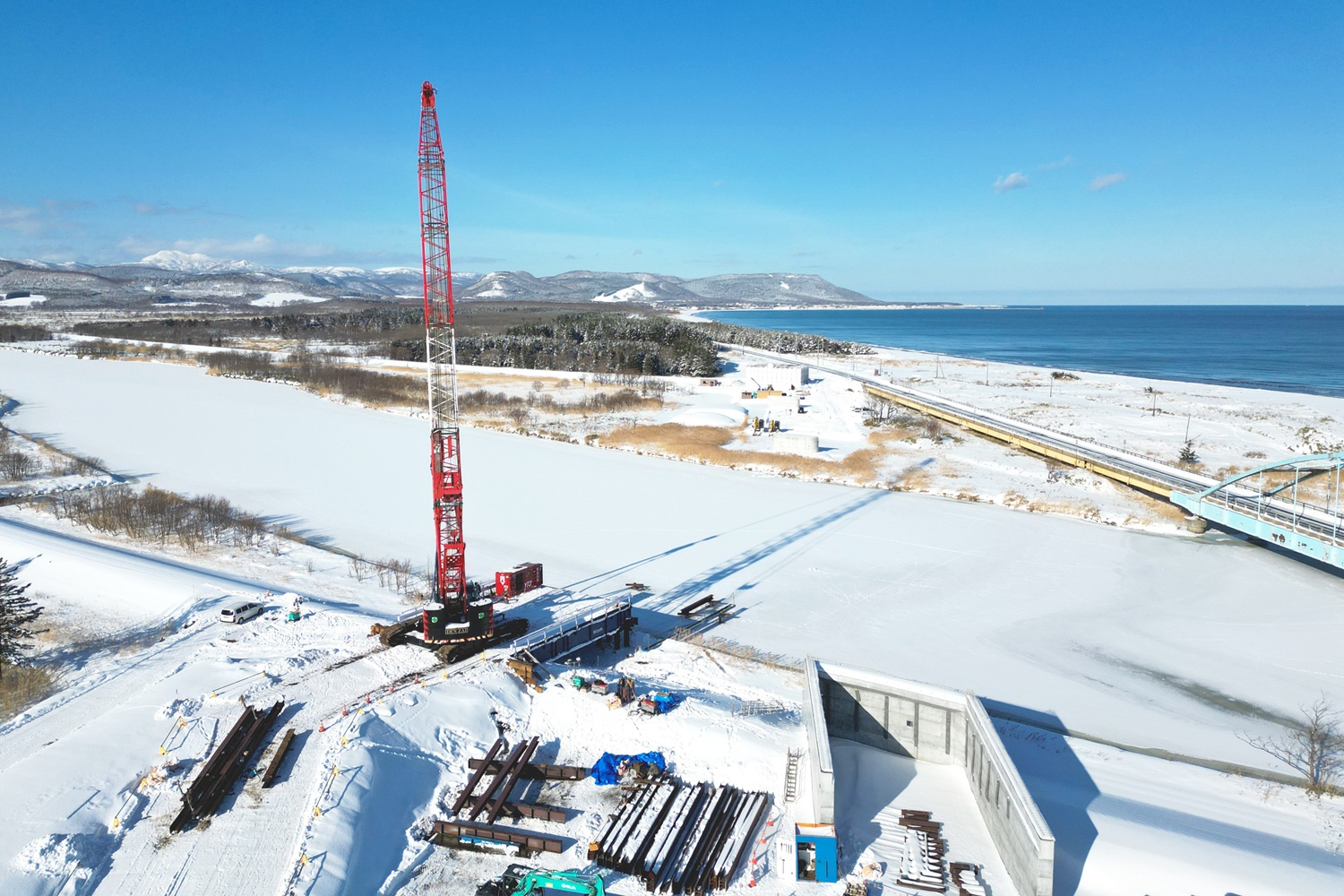 今年最後の記事は、弊社が枝幸町で受注する「一般国道238号 枝幸町幌別橋P1仮桟橋設置工事」の現場情報です。こちらは橋の新設工事において、川の中央あたりに支柱を建設するための仮桟橋を造る工事内容となっています。